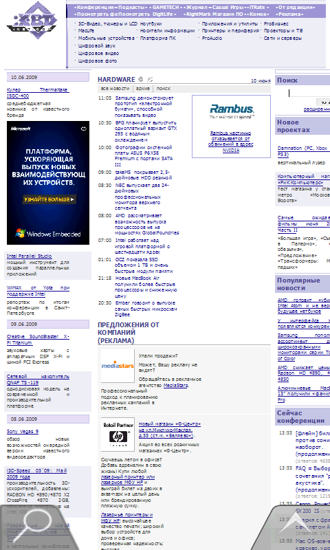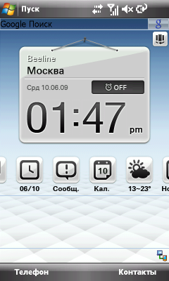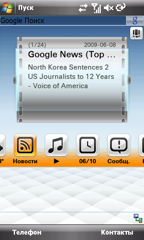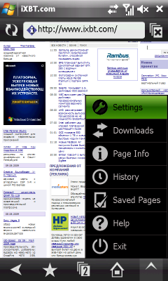 Несмотря на то, что Internet Explorer Mobile из операционной системы никуда не делся, основной интернет-браузер в ASUS P835 Opera Mobile. Предустановленная свежая версия 9.5 программы обладает удобным и быстрым интерфейсом, подготовленным для управления с помощью пальцев, скрывающим ненужные элементы и поддерживающим работу с пятью открытыми на разных вкладках страницами. Поскольку разрешение экрана лишь самую малость недотягивает до полноценного SVGA, большинство сайтов загружаются почти в оригинальном виде. Но без лупы прочитать текст мало у кого получится. На помощь приходят функции быстрого и удобного масштабирования. Хорошо помогает автоматическое приведение содержимого страницы в «мобильный» вид. К сожалению, Opera Mobile не переведена на русский язык. Что, впрочем, не мешает ей нормально работать с кириллицей. Как было ранее сказано, для быстрого запуска браузера достаточно нажать кнопку на лицевой панели.