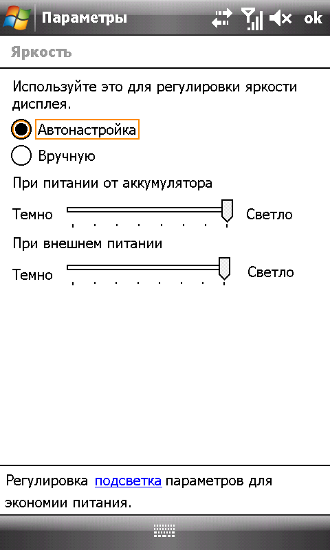 Уровень подсветки экрана регулируется автоматически в зависимости от внешнего освещения. Для этого используется датчик на лицевой панели устройства. При ручной регулировке доступны 8 уровней яркости, но полностью подсветку отключить нельзя. Экран и подсветка отключаются во время блокирования коммуникатора.