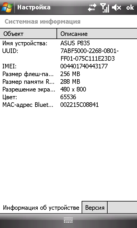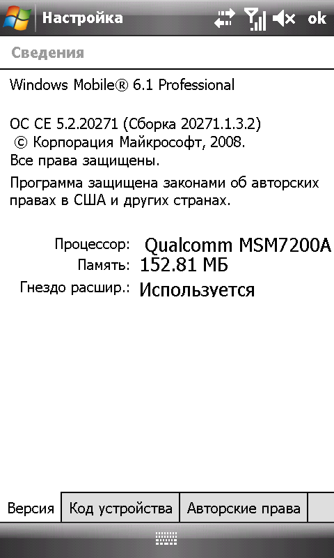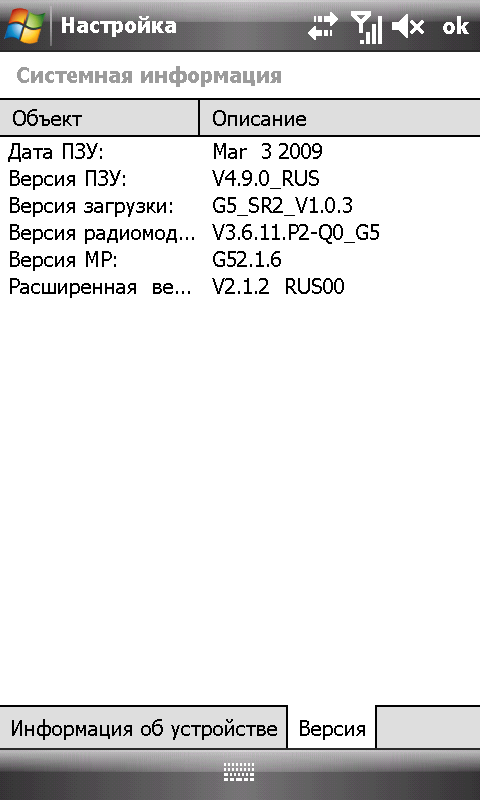 - Операционная система Microsoft Windows Mobile 6.1 Professional, сборка 20271.1.3.2, версия внутреннего ПО V4.9.0 modem V3.6.11.P2-Q0G5;