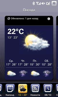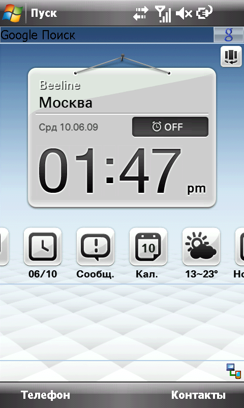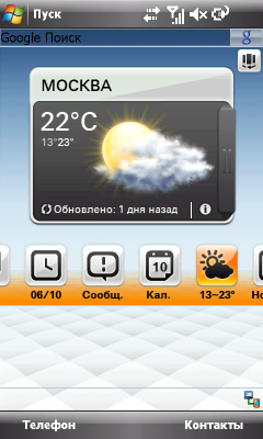 Пользователь ASUS P835 должен легко управлять устройством при помощи пальцев. Но используемая операционная система разрабатывалась с учетом использования пера в качестве средства управления. Из этого противоречия возникает проблема организации удобного «пальцевого» графического интерфейса, по крайней мере, у наиболее используемых функций и программ. Все нынешние производители WinMobile коммуникаторов решают ее с помощью дополнительного программного обеспечения. Кто собственного производства, а кто и приобретает софт у сторонних компаний. В ASUS P835 используется оболочка-замена экрана Today операционной системы, разработанная самостоятельно ASUS Today. Программа представляет собой набор из 3 панелей, каждая со своим стилем: строгий для «работы», яркий и цветастый для «жизни». И «исходная» панель посередине. Каждая панель содержит набор из нескольких виджетов. Наборы отличаются по составу в зависимости от панели. При этом один из них развернут на большую часть экрана, а остальные свернуты в список из иконок. Полный список виджетов: часы, календарь, прогноз погоды, сообщения, фото, аудиоплеер, чтение RSS новостей. Переключение между разными панелями осуществляется с помощью кнопки в верхней правой части экрана ASUS Today. Чуть выше располагается строка поиска Google, страница с результатами поиска открывается в новом окне браузера.