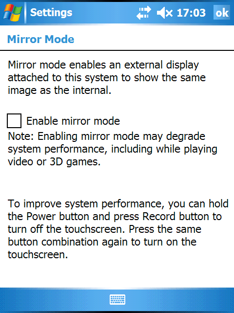 Специфический апплет Mirror служит инструментом управления выводом графической информации на дополнительный внешний монитор. Данная функция является одной из многих уникальных особенностей графического контроллера Intel 2700G. Поддерживается разрешение вплоть до 1024х768 и ускорение вывода трехмерной и видео информации.
