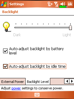 Уровней яркости в настройках немного, максимальное значение превращает коммуникатор в дорогостоящий фонарик, минимальное — отключает подсветку вовсе. В соответствующих настройках коммуникатора можно выставить различные интервалы автоматического отключения подсветки при бездействии устройства и использовании внешнего/внутреннего источника питания.