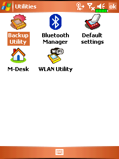 В папке Utilities находятся несколько фирменных утилит для работы с коммуникатором и программы управления беспроводными интерфейсами. Backup Utility, как ясно из названия, создает резервные копии наиболее ценных для пользователя и функционирования системы данных. Архивы можно располагать как во встроенной флэш памяти, так и на SD картах. Насколько полезна данная утилита, пусть каждый решает сам, в WM5.0 все данные уже хранятся в энергонезависимой памяти и без злого умысла стереть их сложно. При достижении критического уровня заряда аккумулятора архивация некоторых файлов запускается автоматически. Восстановить данные из архива так же просто, как и записать их туда, после восстановления необходимо перезагрузить компьютер. Утилита Default settings сбрасывает все настройки произведенные пользователем и удаляет установленные им программы. Этакий программный hard reset.