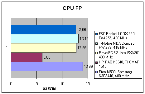 | VOBenchmark | E-Ten M500, Samsung S3C2440, 400 MHz | HP iPAQ h6340, TI OMAP 1510 | RoverPC S2, Intel PXA261, 400 MHz | T-Mobile MDA Compact, PXA272, 416 MHz | FSC Pocket LOOX 420, PXA255, 400 MHz |