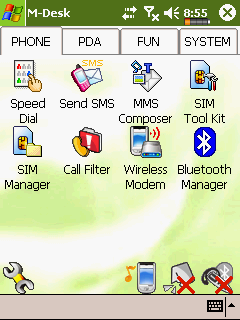 Главный экран обычен для Windows Mobile 2003 SE Phone Edition. Это минимально видоизмененный экран Today, традиционный для Pocket PC, отличающийся наличием индикатора заряда батареи и силы сигнала GSM-сети. Отличительной особенностью M500 является панель с пиктограммами для вызова избранных приложений и утилит.