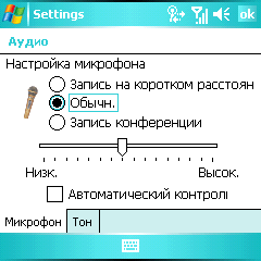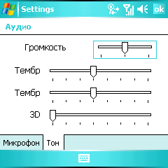 Аппаратная составляющая звуковой подсистемы коммуникатора включает в себя два динамика и один микрофон. Каждый из динамиков занимается своим делом: на лицевой панели обеспечивает звук в режиме телефонного разговора, на задней панели воспроизводит системные сигналы ОС и в меру возможностей проигрывание музыки. Коммуникатор оснащен 3,5 мм разъемом для гарнитуры и наушников. Проблем с подключением любимых наушников нет, в отличие от многих коммуникаторов, использующих для вывода на наушники 2,5 мм разъемы и даже miniUSB. Программная составляющая звуковой подсистемы представлена единственной утилитой Аудио из меню настроек. Программа включает в себя все необходимые настройки и регулировки громкости динамиков и микрофона, а также регулировку низких и высоких частот.
