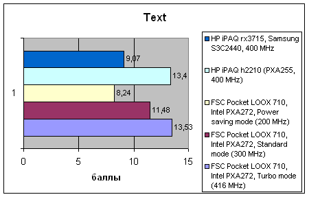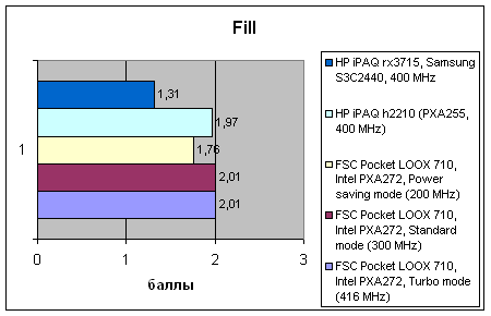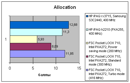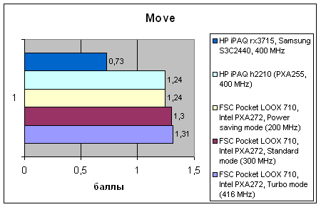 Тесты памяти позволяют объяснить такой результат при работе с видео. Память в Pocket LOOX 710, по всей видимости, очень хорошая. Тест на поиск ячеек дает закономерный результат, пропорциональный частоте процессора, а вот при заполнении и перемещении (то есть там, где реально происходит передача данных) новинка демонстрирует результаты на уровне iPAQ h2210, притом в турбо- и стандартном режимах производительность подсистемы памяти не отличается (!!!). Лишь переход в экономичный режим связан с некоторым, опять-таки, минимальным снижением скорости выполнения операций с памятью.