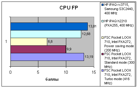 | VOBenchmark | HP iPAQ rx3715, Samsung S3C2440, 400 MHz | HP iPAQ h2210 (PXA255, 400 MHz) | FSC Pocket LOOX 710, Intel PXA272, Power saving mode (200 MHz) | FSC Pocket LOOX 710, Intel PXA272, Standard mode (300 MHz) | FSC Pocket LOOX 710, Intel PXA272, Turbo mode (416 MHz) |