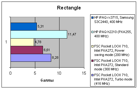 А вот производительность в графических тестах нас откровенно порадовала. И заполнение видеопамяти, и трансформация графических объектов выполняются несколько быстрее, чем на самых производительных в этом отношении Pocket PC – средних и старших моделях iPAQ (представленных в сравнении моделью h2210). Примечательно, что при снижении частоты процессора, производительность графической подсистемы падает в меньшей мере – разница в частоте CPU между турбо- и экономичным режимами составляет 100%, а разница в скорости выполнения графических операций – около 30%.