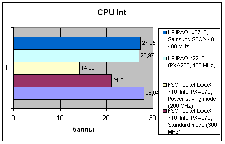 Процессорные тесты показывают, что быстродействие CPU Intel PXA272 416 MHz незначительно выше, чем у 400-мегагерцевых чипов предыдущих поколений. Нужно ли объяснять это дополнительными 16 MHz частоты, или же архитектурными особенностями новых процессоров – вопрос, подробно исследовать который в рамках данного обзора нельзя. Мы склонны считать, что причина именно в усовершенствованной архитектуре. Заметим, что показатели PXA272 примерно равны быстродействию основного конкурирующего продукта – Samsung S3C 2440 400 MHz, в целочисленных вычислениях немного впереди продукт Intel, а в операциях с плавающей запятой – Samsung. Показатели производительности в стандартном режиме соответствуют частоте 300 MHz, а в экономичном – 200 MHz. Как видим, производители КПК отказываются от 100-мегагерцевого режима, энергопотребление новейших чипов Intel и тенденция к увеличению емкости встроенных аккумуляторов (вместо 900-1100 мАч в прошлом году, ныне мы видим 1500-1800 мАч) дают им такую возможность.