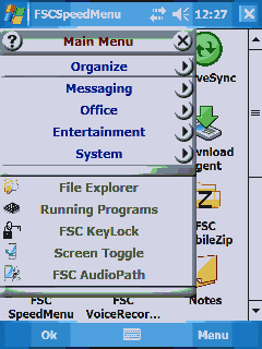 FSCSpeedMenu. Всплывающее меню для более удобного клавиатурного управления программами, а также переключения ряда опций КПК. Представляло бы некоторый интерес, если бы вызывалось отдельной кнопкой. Впрочем, никто не мешает его назначить на одну из имеющихся, другое дело, что это мог бы сделать и производитель.