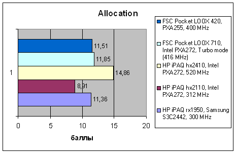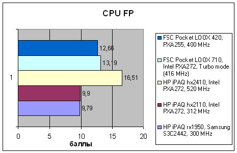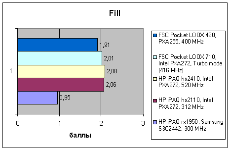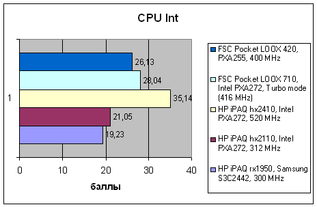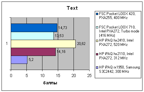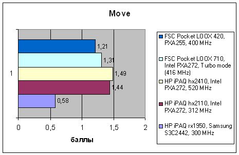 | VOBenchmark | HP iPAQ rx1950, Samsung S3C2442, 300 MHz | HP iPAQ hx2110, Intel PXA272, 312 MHz | HP iPAQ hx2410, Intel PXA272, 520 MHz | FSC Pocket LOOX 710, Intel PXA272, Turbo mode (416 MHz) | FSC Pocket LOOX 420, PXA255, 400 MHz |