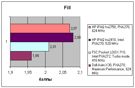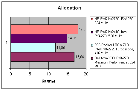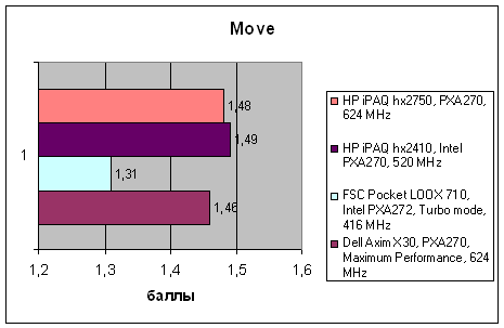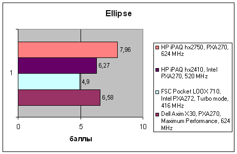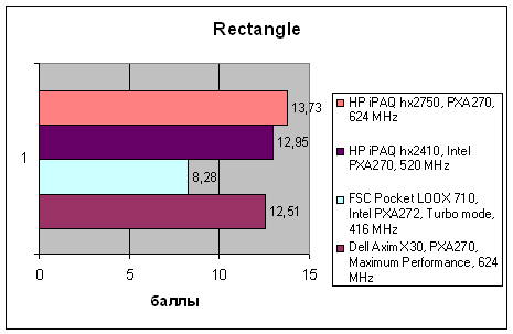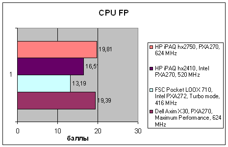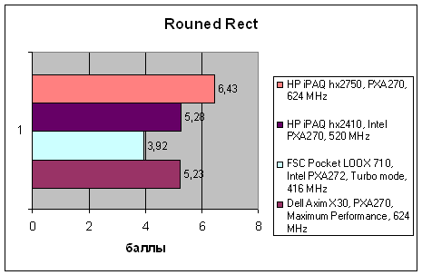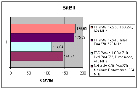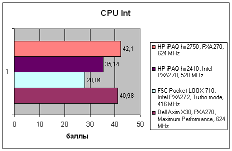 Процессорные тесты в данном случае не очень познавательны, так как скоростные характеристики чипов PXA270 624 MHz хорошо нами изучены. Однако небольшой сюрприз есть и здесь: результаты измерения производительности одинаковых, по сути, процессоров в hx2750 и Dell Axim X30 различаются, небольшой перевес имеет продукт HP, По всей видимости, производительность платформы имеет некоторое влияние и на этот тест, что, в общем-то, нежелательно.