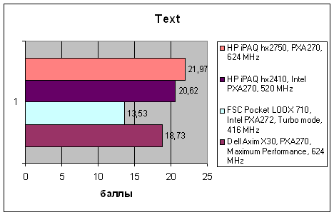 В итоге именно платформа становится ограничивающим фактором для роста производительности hx2750 по сравнению с hx2410. Прибавление в суммарном быстродействии есть, но не очень большое, оно явно не пропорционально росту частоты (а с ней – и производительности процессора) на 104 MHz или на 20%. В тесте Text, отображающем интегральную производительность системы, прирост быстродействия hx2750 относительно hx2410 составляет всего 6,5%.