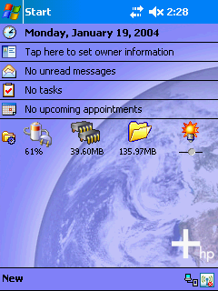 Главный экран hx2750 дополнительно содержит регулировку яркости подсветки, отчет о количестве свободной памяти и доступ к апплету ее очистки, индикатор заряда батареи. Такие же опции можно получить, используя сторонние программы на любом КПК, здесь же соответствующее приложение установлено изначально, и это очень хорошо.