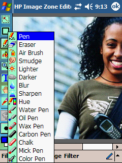 При необходимости можно отредактировать картинку в дополнительной программе HP Image Zone Editor. Здесь пользователю предлагаются стандартные для простых графических редакторов возможности – операции с фрагментами изображения, рисование простых геометрических форм, большое количество разнообразных кистей, ввод текста, заливка, пипетка для выбора цвета, а также множество фильтров, автоматически выполняющих преобразование картинки – усиление резкости, изменение цветового баланса, художественные эффекты и т.д.