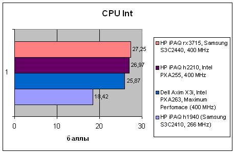 | Тест | HP iPAQ h1940 (Samsung S3C2410, 266 MHz) | Dell Axim X3i, Intel PXA263, Maximum Perfomace (400 MHz) | HP iPAQ h2210, Intel PXA255, 400 MHz | HP iPAQ rx3715, Samsung S3C2440, 400 MHz |