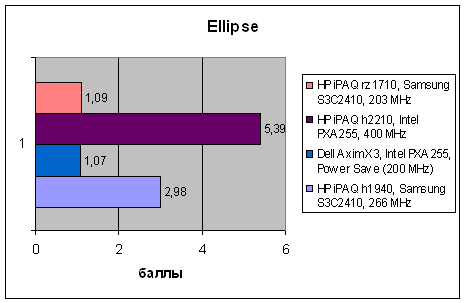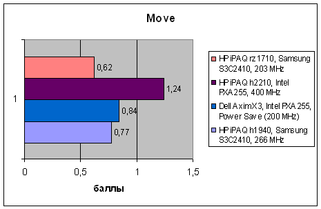 | VOBenchmark | HP iPAQ h1940, Samsung S3C2410, 266 MHz | Dell Axim X3, Intel PXA255, Power Save (200 MHz) | HP iPAQ h2210, Intel PXA255, 400 MHz | HP iPAQ rz1710, Samsung S3C2410, 203 MHz |