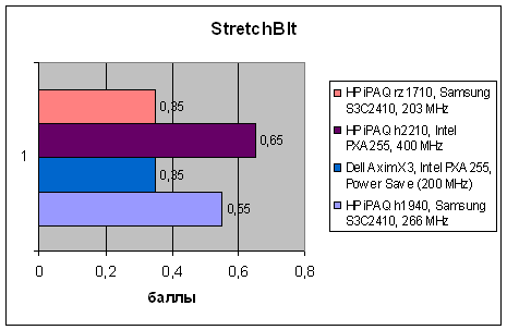 Как видим, производительность 203-мегагерцевого Samsung незначительно выше, чем у PXA255 200 MHz – эту разницу нельзя относить на счет 3-мегагерцевого различия в тактовых частотах. Большая производительность – достижение архитектуры Samsung, хотя преувеличивать ее значение ни в коем случае нельзя – слишком невелик разрыв, так что можно считать, что 200-мегагерцевые процессоры Intel и Samsung демонстрируют равное быстродействие. И, тем не менее, быстродействие 200-мегагерцевой системы значительно ниже, чем даже 266-мегагерцевой.
