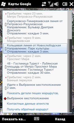 Пешеходы будут в восторге от встроенных Google Maps. Особенно впечатляют возможности поиска маршрута с использованием общественного транспорта. Сервис неплохо работает в Москве, знает расположение и названия остановок, номера маршрутов и даже периодичность движения. Теоретическую, то есть без учета пробок. В выходные дни прогнозы по времени движения весьма близки к реальности. Но в рабочие дни доверять можно только расчетному времени между станциями метро.