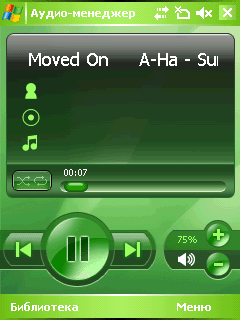 Аудио-менеджер является именно тем проигрывателем музыкальных файлов, который запускается из Медиа-хаба. Помимо приятного интерфейса (навеянного Apple iTunes), он поддерживает создание списков воспроизведения, а также наполнение музыкальной библиотеки, куда автоматически добавляются все найденные в памяти коммуникатора аудиофайлы. Само собой, только те, которые Аудио-менеджер поддерживает. В процессе прослушивания можно установить понравившуюся мелодию в качестве сигнала телефонного звонка.