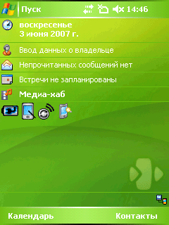 Чуть выше находится ссылка на приложение Медиа-хаб, упоминающееся на коробке с коммуникатором. Ничего особенного программа собой не представляет, это красиво оформленный менеджер мультимедиа-возможностей карманного компьютера. Четыре ссылки на экране медиа-хаба ведут к проигрывателю музыкальных файлов, папкам с фотографиями/видеозаписями и программе с настройками аудиосистемы.