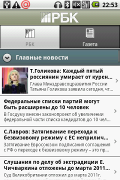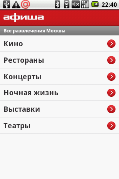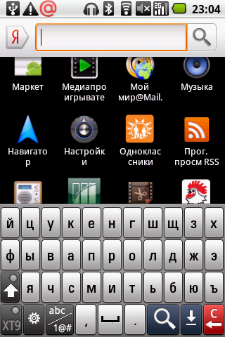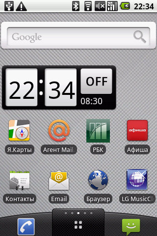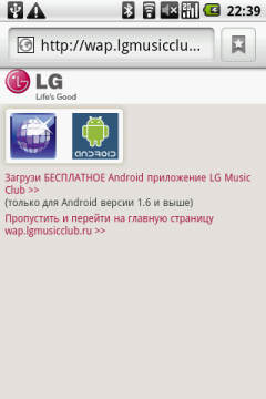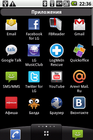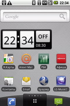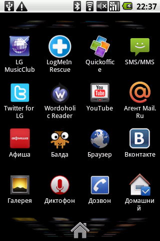 На основном экране находятся следующие виджеты и ярлыки приложений: часы, Яндекс Карты, Агент Mail.ru — клиент одноименной сети мгновенных сообщений, РБК — программа для чтения новостей с одноименного портала, Афиша — удобная программа для поиска развлечений в городе от популярного журнала и интернет-портала. Там же находятся иконки контактов, интернет-браузера и ссылка на портал LG MusicClub. Нажатие на этот значок привело к открытию страницы LG MusicClub в браузере, где было предложено скачать и установить одноименное приложение (казалось бы, уже установленное в коммуникаторе). Попытка выполнить это действо закончилась неудачно — программа устанавливаться не захотела. (В новой версии прошивки программа устанавливается). Ну да ладно, вышеуказанный портал предоставляет также доступ к различному контенту, в подавляющем числе платному: музыке, видео и Java-играм. На портале коммуникатор определился, как еще не выпущенный LG C710. (С новой прошивкой коммуникатор определяется правильно). Отраден факт, что как полноценный Google-phone, LG Optimus имеет доступ в обычный Android Market.