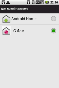 На перечислении многочисленных нужных и не очень программ описание возможностей рабочего стола системы в LG Optimus не заканчивается. Всю вышеперечисленную красоту, имя которой LG Дом можно сменить на стиль оформления Android Home в приложении Домашний селектор. Android Home — это обычный вид рабочего стола системы, в меньшей степени перегруженный различными иконками и виджетами.