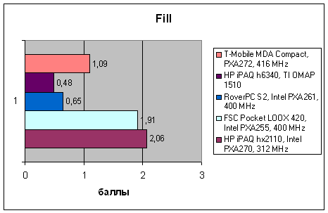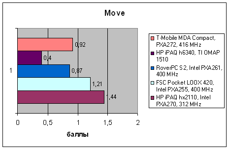 | VOBenchmark | HP iPAQ hx2110, Intel PXA270, 312 MHz | FSC Pocket LOOX 420, Intel PXA255, 400 MHz | RoverPC S2, Intel PXA261, 400 MHz | HP iPAQ h6340, TI OMAP 1510 | T-Mobile MDA Compact, PXA272, 416 MHz |