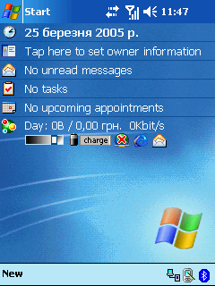 Главный экран коммуникатора не очень отличается от обычного окна Today в Pocket PC, но разница все же есть. В верхней строке интерфейса, как обычно для Phone Edition, добавлены индикаторы сигнала GSM-сети и состояния GPRS-соединения. Нижняя строка содержит дополнительно пиктограмму, нажатие на которую циклически переворачивает экран из портретной ориентации в альбомную, повернутую влево и вправо относительно корпуса коммуникатора. Но самое заметное отличие – это дополнительная панель в окне Today, на которую выводятся: счетчик GPRS-трафика, регулировка яркости экрана, индикатор заряда батареи (указывается оценочная продолжительность работы до полного ее разряда), а также пиктограммы для вызова Internet Explorer и программы для работы с сообщениями.