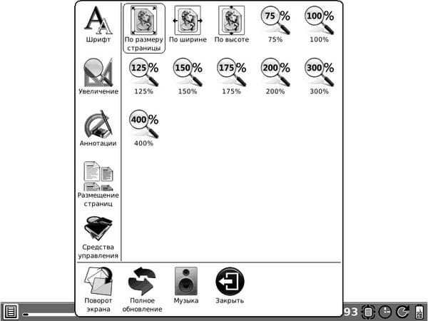 При просмотре PDF тоже имеется много настроек, но они другие. Масштабирование страницы может быть задано в процентном соотношении (от 75 до 400 процентов), но страница может также быть подогнана под размеры экрана. Есть и выделение «выбранной области», что позволяет отсечь все пустоты на странице, уделив больше места для текста. Меняется и размер шрифта, он указан в процентах от 100 до 500. К книге можно делать пометки — как рукописные (грубо говоря, вы рисуете поверх текста, и эти рисунки при следующем открытии книги никуда не пропадают), так и «машинописные», набираемые на виртуальной клавиатуре. Они заносятся в базу, которую можно открыть и посмотреть все сделанные аннотации (именно так они называются).