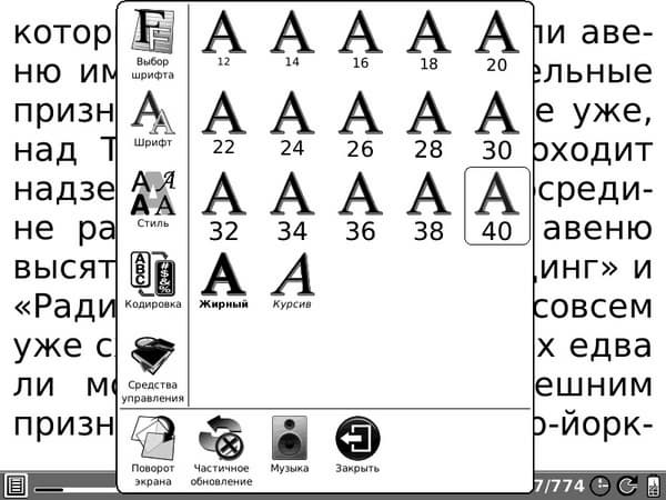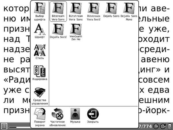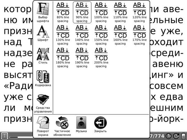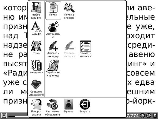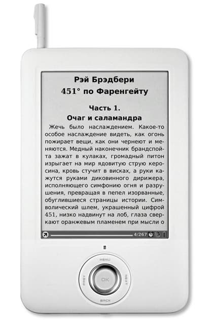 С последней на данный момент версией прошивки (1.4) книга читает уйму форматов. Это FB2, FB2.ZIP, DOC, PDF, EPUB, DjVu, TXT, TXT.ZIP, HTML, RTF, MOBIPOCKET (Non-DRM), CHM, PDB. Другими словами, самые популярные у нас форматы (и не только) поддерживаются этой книгой. Даже если вы скачаете с помощью встроенного браузера книгу в формате FB2. ZIP, не окажется проблемой отсутствие архиватора — книга и так откроется.