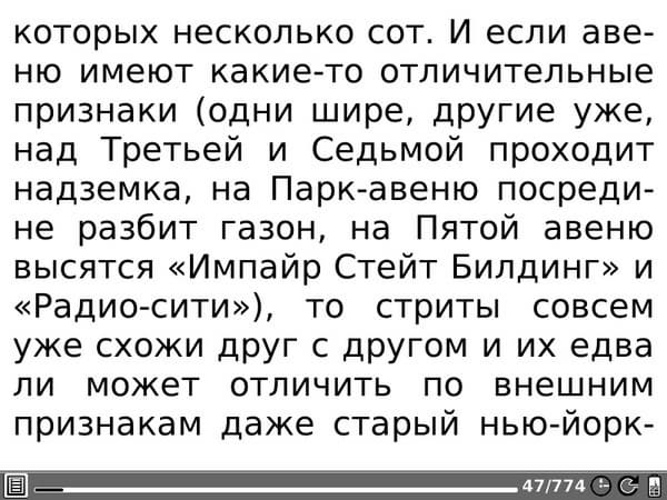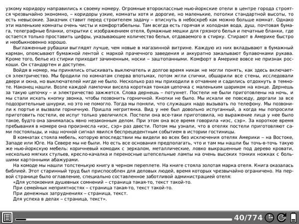 Итак, подведем краткий итог: книга хорошо и быстро читает самые популярные форматы электронных книг. Есть практически весь инструментарий для удобного чтения каждого формата. Хотелось бы, правда, поддержку оглавления для FB2.