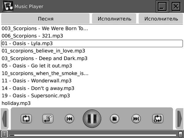 Плеер в книге может проигрывать музыку формата MP3. Вкупе с обычным, стандартным гнездом для наушников, плеер вполне пригоден для использования. Разумеется, музыку можно слушать и при чтении, и при «прогулках» по интернету в браузере. Музыка открывается из папок, здесь тоже нет никаких библиотек.