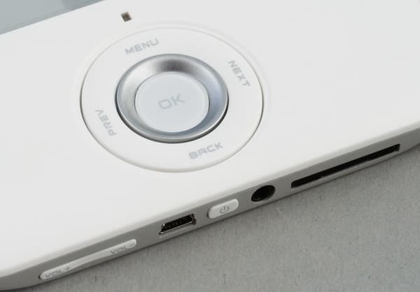 На нижнем же торце расположены и все гнезда: для наушников (благо, обычное, 3,5 мм в диаметре), для mini-USB кабеля (тоже хорошо) и для карт формата SD/SDHC (тоже отлично). То есть здесь все очень хорошо, никаких премудростей, переходников и прочих «радостей».