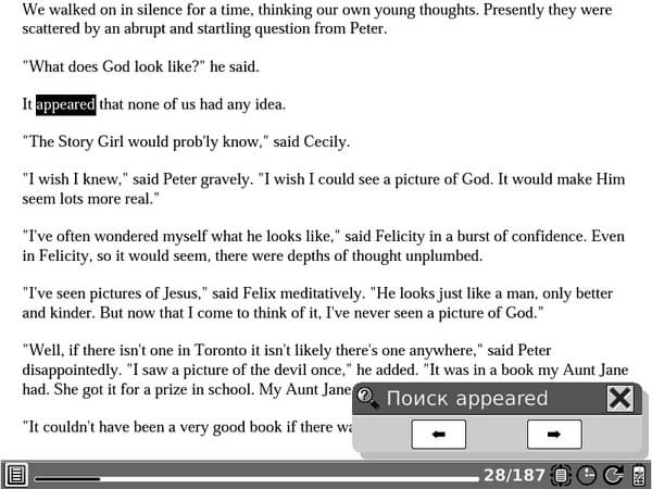 Итак, давайте рассмотрим основные возможности просмотрщика. Наибольшее количество настроек имеется при просмотре форматов FB2 и DOC. Единственные минусы — нельзя просмотреть оглавление и не поддерживаются сноски. Итак, поехали. Имеются настройки шрифта. Можно изменить как сам шрифт, так и его размер и начертание (курсив и жирный). Изменению подлежит и межстрочное расстояние, оно указывается в процентах. Как и во всех остальных форматах, есть поиск слов. Если вдруг кодировка файла FB2 не отображается корректно, можно сменить ее прямо в настройках, без помощи компьютера. Все те же самые возможности имеются и при просмотре формата DOC. Нормально поддерживаются переносы слов.