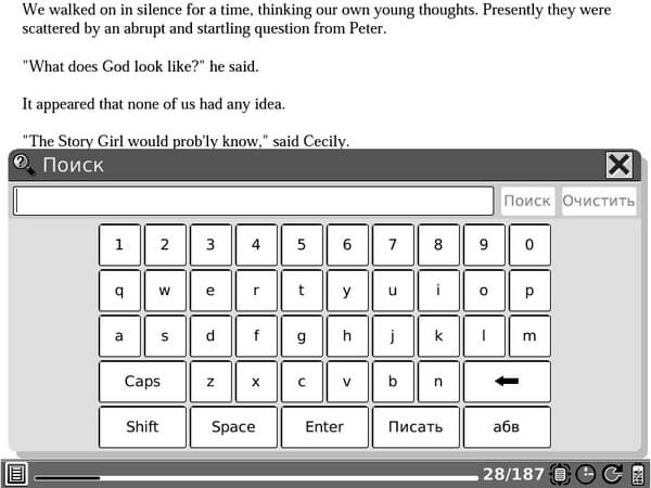 Можно вводить рукописный текст. Книга пытается распознать написанные буквы. Но этот способ очень медленный, каждую букву приходится подтверждать. Лучше уж пользоваться обычной клавиатурой.