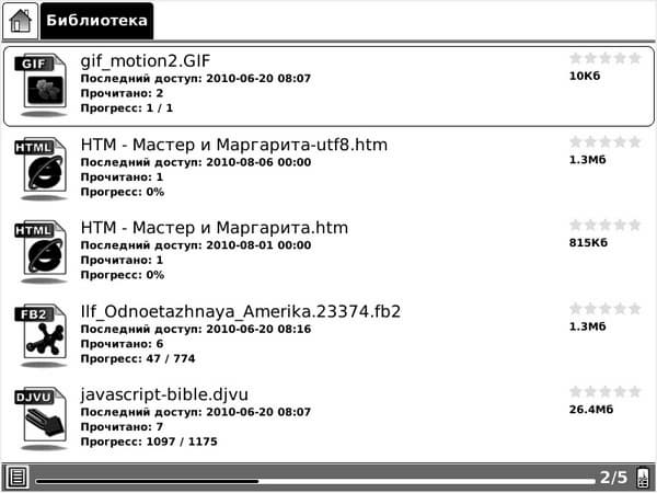Туда попадают все файлы из внутренней памяти — книги и музыка, картинки и HTML-файлы. Файлы с карты памяти доступны в «SD-карта». Никаких других мест, откуда можно получить доступ к файлам, нет, да это и не нужно. В настройках можно отсортировать файлы по имени, типу, размеру, времени доступа, рейтингу, в прямом и обратном порядке, в виде миниатюр, списка или подробной таблицы. Последняя отражает название файла, его расширение, дату и время последнего прочтения, сколько раз файл был прочитан, прогресс (количество прочитанных страниц из всего их количества), размер. Никакие метаданные, типа имени автора, жанра и тому подобного, не используются — только имя файла.