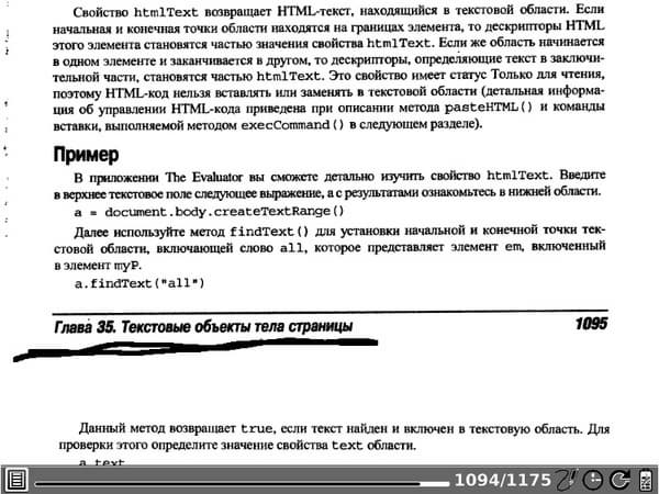 Очень удобен инструмент «Рука». Водя стилусом по экрану, вы подвигаете текст ровно настолько, насколько сдвинулся кончик стилуса. Текст «ворочается» на экране достаточно быстро. PDF удобно читать, установив ландшафтную ориентацию экрана и установив в настройках «режим свитка», когда текст идет сплошняком, а не разбивается на страницы. Неудобно лишь, что при переходе на следующий экран переносится где-то три-четыре строки уже прочитанного текста. Приходится искать глазами новые, еще не прочтенные строки. При чтении PDF доступен словарь, поиск слов, озвучивание текста (только английского), закладки.