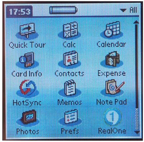 Откинув защитную резиновую крышечку, можно насладиться видом выключенного экрана. Затем, во избежание полного разочарования, крышку лучше закрыть. Если не последовать этому совету и включить КПК, перед глазами предстанет печальное зрелище: цветной STN экран (65536 цветов), разрешением 160x160 пикселей, весьма невысокого качества. Невооруженным глазом видно мерцание, особенно на фоновом рисунке, установленном по умолчанию. Яркость экрана может быть выставлена в положение low (при такой установке можно комфортно работать в полной темноте) или high. При ярком солнечном освещении на экране ничего не видно вне зависимости от установок яркости/контрастности.