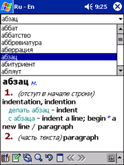 Общее замечание: программные реализации словарей для КПК организованы так, чтобы пользователь выбирал, а не набирал текст. Все программные словари используют функцию автонабора, имеющуюся в КПК: система по началу вводимого слова старается угадать его целиком и предлагает вам уже готовые варианты (от 1 до 4, в зависимости от установок на КПК). Как своего рода следствие, отсюда — отсутствие ключевой функции: проверки правописания. Исключением является Lingvo. Нет также в программных словарях возможности поиска примеров по заданному тексту. См. нашу публикацию [1], где эта тема обсуждалась подробно.