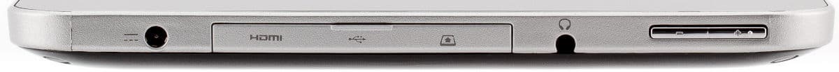 Боковые ребра задействованы неравномерно: левая часть планшета освобождена от каких бы то ни было интерфейсов, в то время как ее правая коллега ими буквально перегружена. Итак, здесь находятся: разъем для подключения блока питания, 3,5-миллиметровый выход для наушников, регулятор громкости, а также общая заглушка для порта HDMI, USB-хоста и слота карты памяти MicroSD.