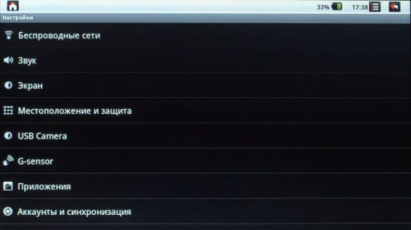 Настроек в системе (следующая кнопка объемного меню) великое множество, впрочем, большинство из них доступно всем пользователям Android и являются стандартными. Среди пунктов встретился G-Sensor — включение гравитационного датчика для участия в играх, а также собственный инструмент Software Tool, используемый для обновления системы и приложений.