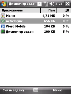 Вот даже дополнительный «Диспетчер задач» имеет традиционный интерфейс с управлением софт-кнопками. Впрочем, функциональность его невелика — просто сама по себе Windows Mobile без надстроек приложения только сворачивает, а лазить в апплет «Память» для «убийства» уже ненужных приложений то еще удовольствие, вот и сделали маленькую, но более удобную программку. Но тенденция на лицо: аппаратно G7 вполне пригоден для пальцевого ввода, а вот о программной составляющей производитель не позаботился. Кстати — обратите внимание на прожорливость «Меню» при всей его простоте ;)