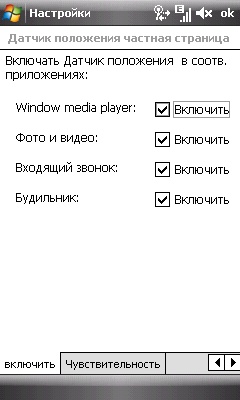 Наличие гравитационного датчика позволяет отслеживать положение устройства в пространстве. Польза в настоящий момент от этого сенсора небольшая, операционная система его как следует не поддерживает. Автоматически изменять ориентацию экрана умеют несколько приложений: Windows Media Player, Фотоальбом и непонятно как попавшие в этот список Будильник со Списком входящих звонков. Которые, кстати, работают с G-сенсором. Будильник можно отключить, встряхивая аппарат. Этим же нехитрым способом можно и принимать звонки.