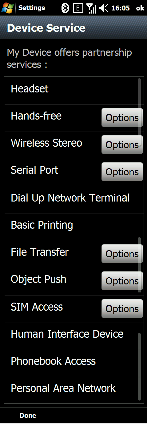 Bluetooth 2.0 + EDR поддерживаемые профили (GAP, OPP, SPP, SDAP, FTP, SAP, HSP, HFP, BPP, GAVDP, AVRCP, A2DP, HID, PAN) дополнительно отображены на скришноте. Стек используется от Microsoft, о возможности установки оного от Broadcom информации на данный момент нет.