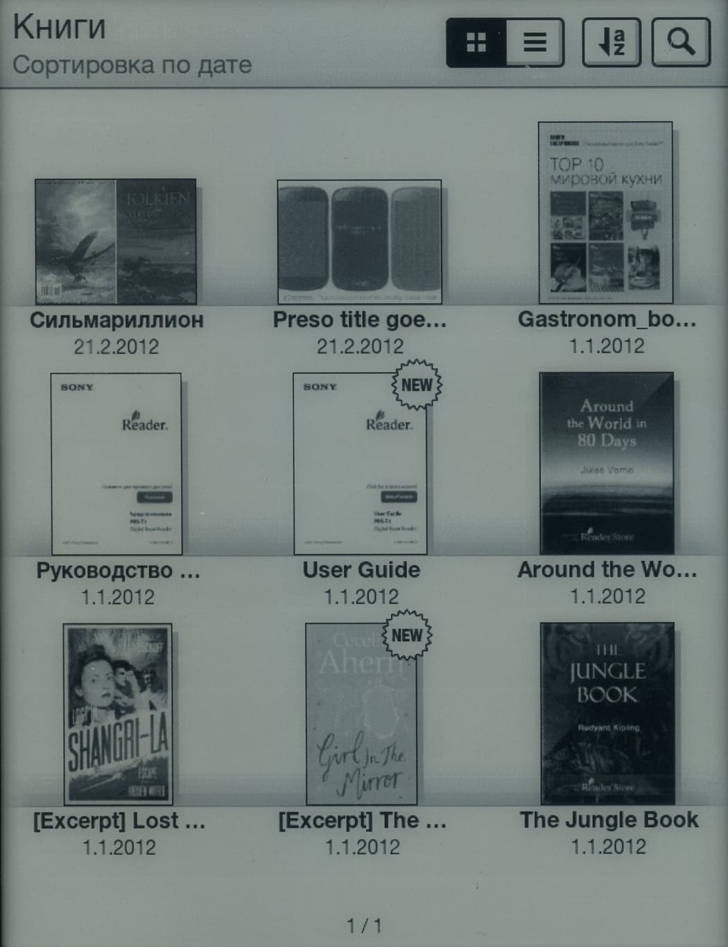 Раздел «Книги» может быть представлен как вертикальным списком, так и «плиткой» из мини-обложек всех находящихся в памяти ридера книг. Именно так: все книги, попавшие на карту памяти или непосредственно в память устройства, появляются в этом списке независимо от количества внутренних папок, строение которых, оно не понимает. Так что нет никакого смысла строить папочную иерархию, а следует воспользоваться инструментом под названием «Коллекции».