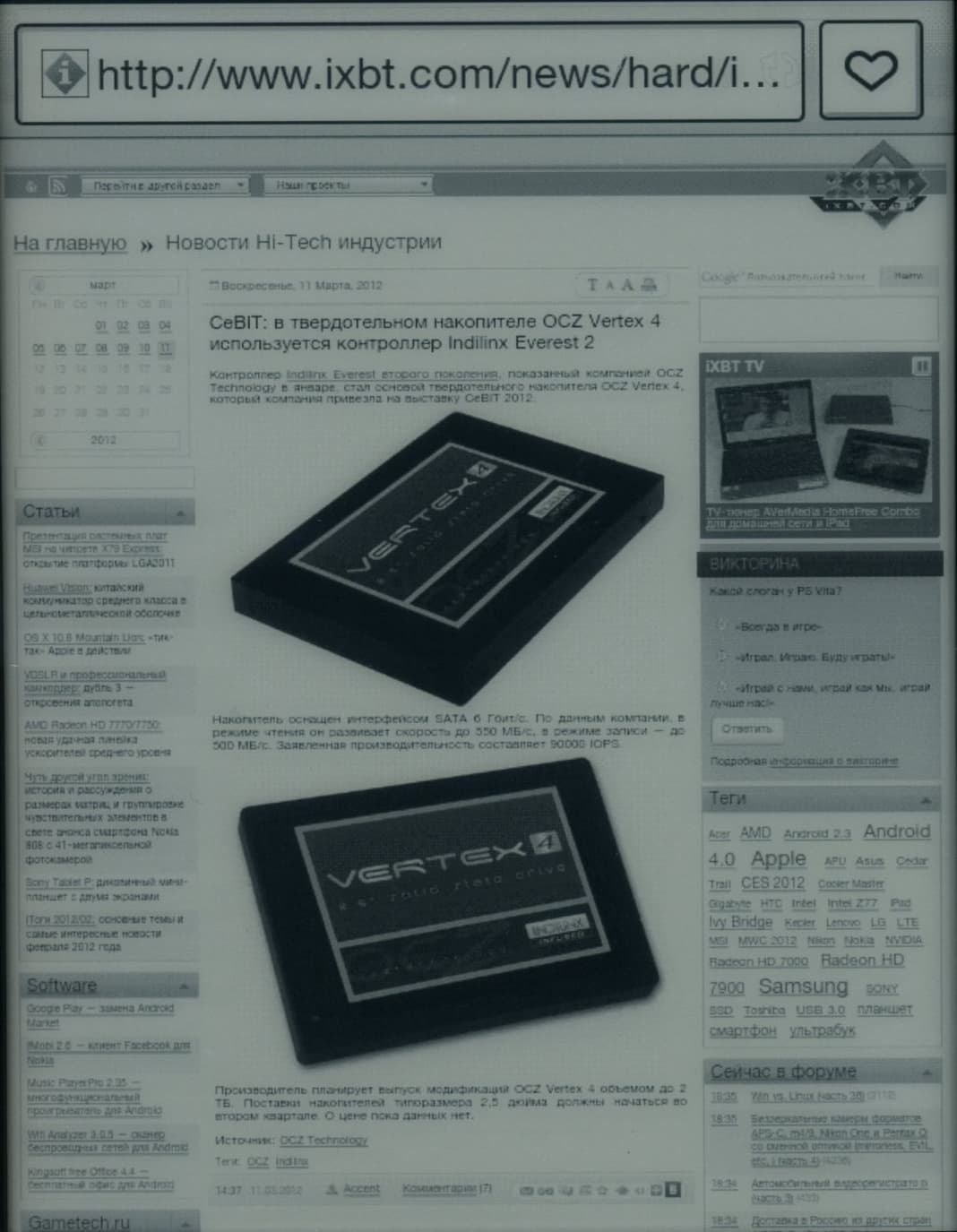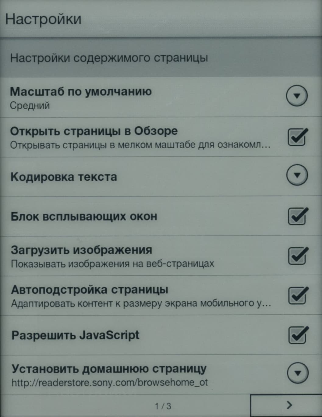 В связи с тем, что Sony Reader PRS–T1 оборудован модулем Wi-Fi, становится возможным использование встроенного браузера, который, кстати, оказался весьма качественным. Странички прорисовываются и масштабируются жестами быстро и качественно, а процесс этот не вызывает раздражения. Браузер обладает огромным количеством настроек, которые разместились на трех страницах. Серфинг по интернету с таким браузером стал делом вполне комфортным, тем более что модуль Wi-Fi умеет запоминать пароли закрытых сетей и автоматически подключаться к ним при повторном обнаружении.