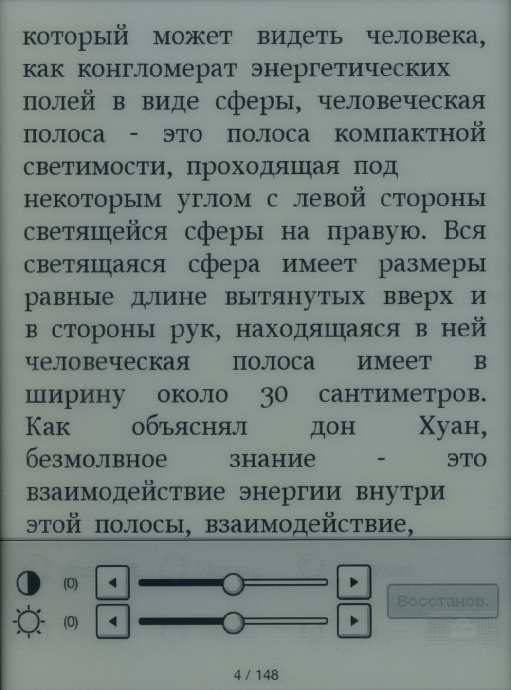 Во время чтения страницы можно перелистывать как нажатием кнопок «Вправо»/«Влево» (это особенно удобно левше, так как кнопки оказываются ровно под большим пальцем), так и простым горизонтальным движением пальца по экрану. Боковых клавиш для перелистывания здесь, к сожалению, нет — а ведь они так бывают удобны при вертикальном расположении книжки. Правда, при такой минимизации размеров корпуса и рамки вокруг экрана, сомневаюсь, что была бы возможность их тут разместить.