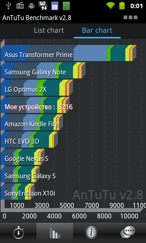 | Sony Walkman Z 2×1 ГГц (Android 2.3) | Samsung Galaxy Advance 2×1 ГГц (Android 2.3) | Huawei Honor 1,4 ГГц (Android 4.0) | Samsung Galaxy S II 2×1,2 ГГц (Android 2.3) | Samsung Galaxy S 1 ГГц (Android 2.3) | |